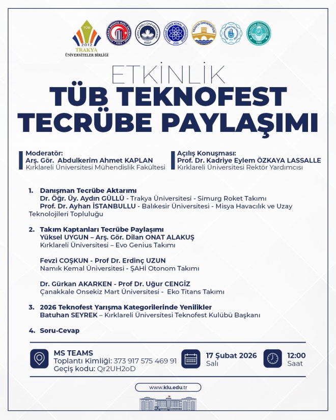 Trakya Üniversiteler Birliği (TÜB) bünyesinde düzenlenen “TÜB TEKNOFEST Tecrübe Paylaşımı” etkinliği, 17 Şubat 2026 Salı günü saat 12.00’de çevrim içi olarak gerçekleştirilecektir.